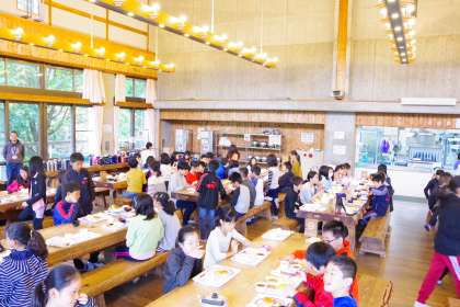 花背山の家の2日目のスタートです。朝の会を終えた子どもたちは、元気に朝ごはんを食べました。天候が回復したので、これから天狗杉ハイクに向かいます。