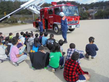 今日の3・4時間目に消防出前授業がありました。はしご車を見たり,防火着を着たり,消火器を使って火を消す練習をしたりと,いろいろな活動をしました。消防士のお仕事や消防車が好きなみんな。興味がさらに高まる学習でした。