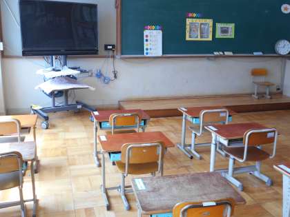 みんながいないととてもしずかで,つくえやいすもさびしそうにみえます。