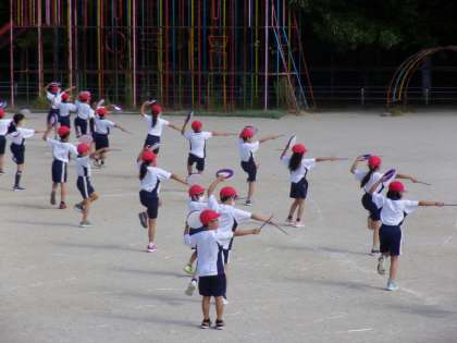 2年生は民舞にチャレンジしました。パーランクーを持ち,元気に楽しく踊る2年生。一つ一つのキメのポーズにも力が入ります。