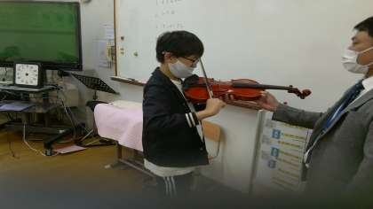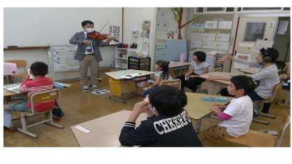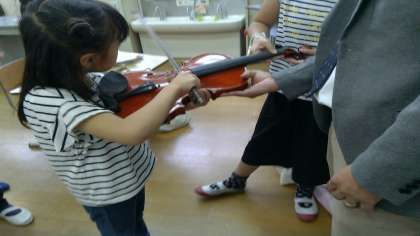 特別ゲストとして教頭先生に来ていただき,子どもたちのリクエストに応じてヴァイオリンを弾いていただきました。パプリカ,ドラえもん,となりのトトロ,アンパンマンなど自分たちの好きな曲の生演奏を聞いてうれしそうでした。また,一人ずつヴァイオリンを弾く体験もして,「弾けた。」と喜んでいました。最後には,「体育参観日頑張ってね。」とエールを込めて「情熱大陸」を弾いていただきました。芸術の秋を感じ,パワーをもらったひと時でした。