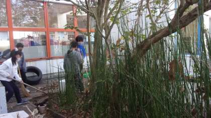 玄関の左側,なかなか手を付けにくい日陰を利用した植生のスペース周りに気づいたグループが掃除をしています。