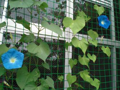 ようやく,2階の窓まで蔓が伸びました。毎日,数個ずつ美しい花を開きます。見とれるような青です。
