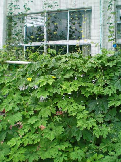 4年生が栽培しているツルレイシ。ウリ目,ウリ科,ツルレイシ属の植物です。果肉が苦いために「ニガウリ」とも呼ばれ,沖縄本島では,「ゴーヤー」 沖縄料理のブームもあって全国的には,「ゴーヤ」が一般的です。
