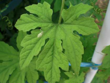 黄色のかわいい花をつけている「ツルレイシ」これからイボイボのある独特の実を結ぶでしょう。7つの切れ目がある線対称に近い美しい葉を見つけました。いつも何気なく見ている植物もよく観察するといろいろな発見があります。