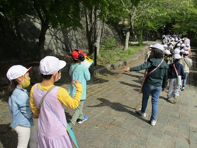 今日は3年生と一緒に校区探検に行きました。天候にも恵まれ,外は暑いと感じるほど晴れていました。桂坂小学校を出発して野鳥遊園の前を通り,山の里公園で少し休憩をして御陵公園まで歩きました。少し長めに休憩をして桂坂小学校まで帰ってきました。手を取り一緒に歩いてあげている姿など,さすが上級生と感じる場面も見られました。