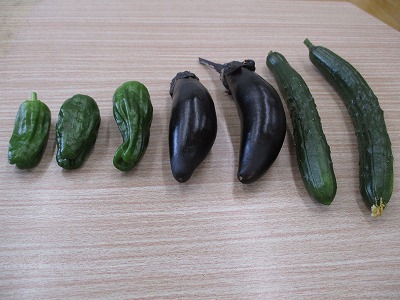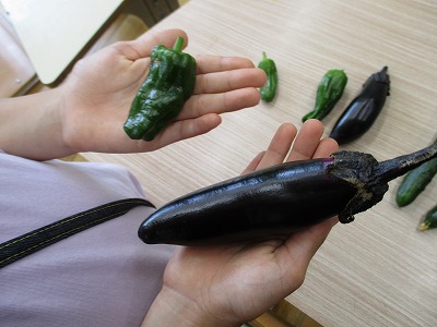 今日の5時間目に,土日で大きく育った野菜を収穫しました。子どもたちは自分たちの手より大きく育った野菜を収穫してとてもうれしそうにしていました。今回はきゅうりとなすび,ピーマンの3種類を収穫することができました。天候にも恵まれてとても生長がはやくたくさんとれています。水やりの時も子どもたちは「大きくなあれ」と愛着を持って育てています。お家で食べておいしかったとうれしそうにしている姿も見られます。これからもみんなで協力して育てていこうと思います。