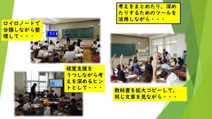 各学年の学習の様子です。視覚的支援となるスライドを活用して,考えのヒントを提示したり,自分たちの考えがどのように分類されるのかをロイロノートを使って整理したりするなど,子どもたちの考えの深まりを意識しながら学習を組み立てています。