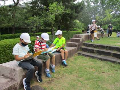 前回3つのコースに分かれて,それぞれ3つの公園を探検しました。今回は,3つの中から1つの公園を選んで,公園の植物や遊具,生きものなどグループごとにテーマを決めて調べました。