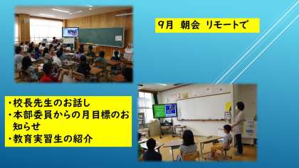 今日の1時間目に朝会を行いました。リモートで校長先生のお話や,児童会本部委員からの月目標についてのお知らせ,教育実習生の紹介などを聞きました。