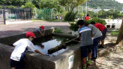 毎朝,池の周りに集まってメダカや水生昆虫を眺めていた子どもたち。最近濁りがひどくなってきて,生き物を見ることができなくなっていました。