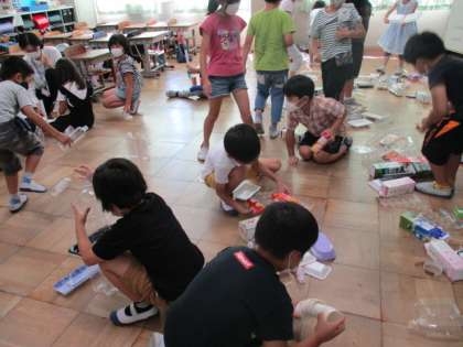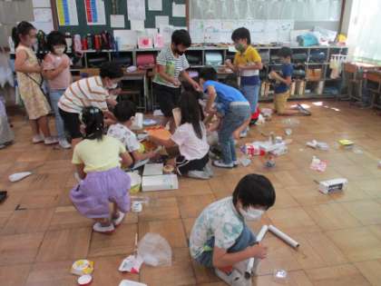 今日の学習では,お家の方にもご協力いただいて集めてきた廃材を使って遊びました。