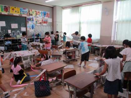 友だちと協力しながら,新聞紙を細く切って長くつないだり,つるしたりして,楽しく活動しました。