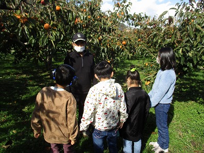 地域の特産品として柿ののぼりを見つけ調べてみたいという思いから,今回は見学に行くことにしました。子どもたちは見学をとても楽しみにしていて,農園に着くまでの道のりもうれしそうに歩いていました。
