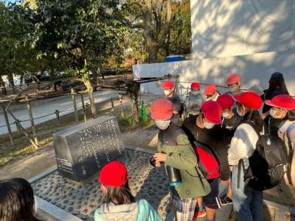 資料館見学を終え,公園内を少し歩きました。多くの慰霊碑や被爆アオギリを見て,新たな気づきがいっぱいです。被爆アオギリ二世の苗木もいただきました。学校で育てることを通して,平和を想う心をさらに高めていきたいです。