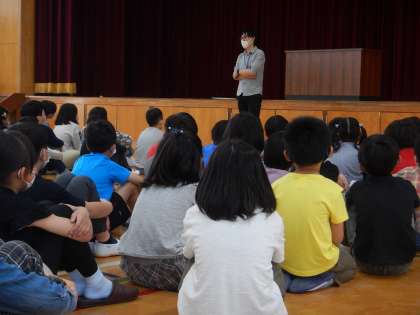 4年生になって初めての学年集会です。高学年の仲間入りをする4年生。1年間をみんなで気持ちを一つにしてがんばっていきたいと思います。今年の学年目標は『FOR YOU』です。これまでの3年間で身につけた力を,どんどん発揮してほしいと思います。