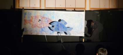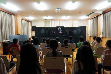 本とお話しのクラブの方々に「はらぺこあおむし」や「スイミー」などの読み聞かせをしていただきました。ギロやタンブリンを使用した音の演出,ブラックライトや巻き物の表現の演出など様々な工夫がされていました。子どもたちも「きれい!」「毎日でも見たい!」と,とても感動していました。