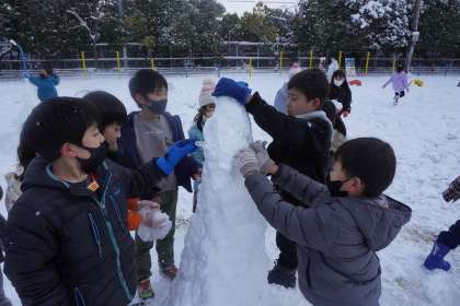 24日夕方からの雪で、今朝の学校は一面銀の世界。2年生の子どもたちにとって、雪は恰好の遊び相手です。友達と協力しての雪だるま作り、雪の上での競争、寒さを忘れるほどたくさん体を動かしました。長いつららや固まりにくいさらさらの雪に驚くなど、なかなか積もることのない雪で、貴重な体験ができました。