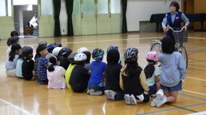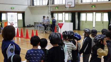 4年生は、西京警察署や交通安全推進会の方などの協力で自転車交通安全教室を実施しました。交通ルールは年々変化しており、最近では、自転車乗車時にヘルメット着用の努力義務が課せられるようになりました。