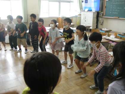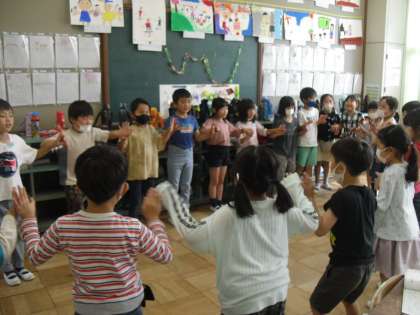 音楽科「はくのまとまりをかんじとろう」では、3拍子のリズムについて学習しています。「たぬきのたいこ」に合わせて手拍子を打つ活動の後に、ひざ→手拍子→友だちとタッチで3拍子のリズムを打ってみました。最初は2人組、そして4人組、8人組と増やしていき、最後はクラス全員で輪を作ってリズム打ちをしました。一発大成功に子どもたちは大歓声をあげていました。