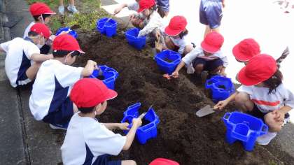 1年生は、2年生からもらった「アサガオの種」をまくために、植木鉢に土を入れました。