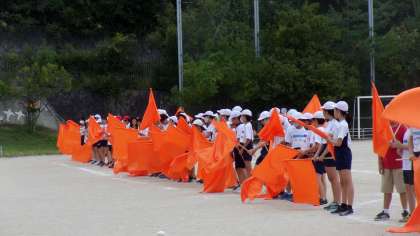 6年生のフラッグの演技。フラッグの風をきる音が、気持ちを高めていきます。