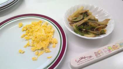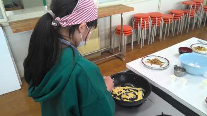 調理実習で色どり野菜炒めとスクランブルエッグをつくりました。卵を割ったり炒めたり難しいことも助けあいながら楽しく調理することができました。完成した料理はみんなでおいしくいただきました。
