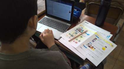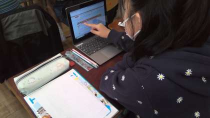 外国語の授業では、修学旅行で訪れる広島県について調べています。調べた中からおすすめスポットを見つけ、パンフレットを作って英語で紹介します。「Hiroshima has Itsukushima shrine.」など、学習した表現を使って友達とおすすめの場所を伝えあっていました。