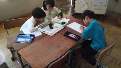 生活科の学習で、ナスとピーマンを苗から植え、成長した様子を観察しました。「触った感じがつるつるとざらざらでちがうね。」「葉っぱの数もちがうよ。」「葉っぱの色もちがうね。」など、それぞれに気付いたことを観察カードに絵と文でまとめました。これからも水やりをしながらお世話をして、実を収穫するのが楽しみですね。