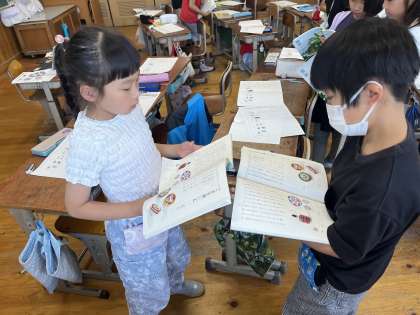 子どもたちが問いに対する答えを見つけ、互いに確認し合っている様子です。