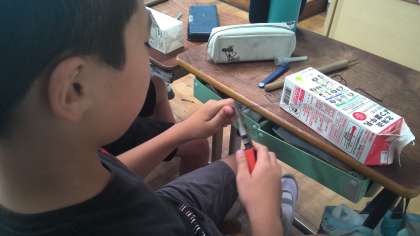 工作「くるくるクランク」の作品をつくっています。今日は、牛乳パックと針金を組み合わせて、くるくる回すと飾りが動く仕組みづくりをしました。針金をどう曲げると面白い動きになるか試行錯誤しながら制作することができました。