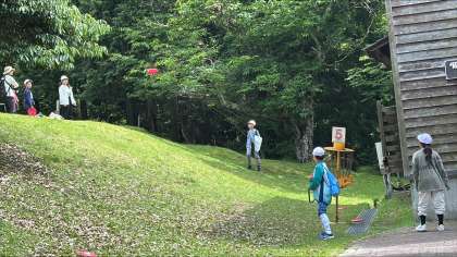 花背山の家2日目、午後の活動はフライングディスクゴルフです。花背山の家の所内の、かごのような的をめがけて、フライングディスクを投げます。ゴルフと同じように何回投げて入ったかを競います。天候がとてもよくなって、暑いくらいの山の家です。