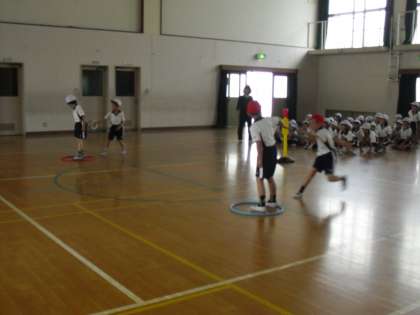 体育では,ゆうぐあそび,おにあそびと学習を進め,次はリレーあそびの学習に入りました。