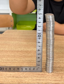 算数科の学習で、1円玉を積み重ねて長さを測りました。