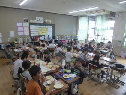 いつものクラスでの慣れてきた給食準備とは違い、学年が違う仲間の分も準備をするので、準備は5・6年生の人たちが、丁寧に進めてくれました。