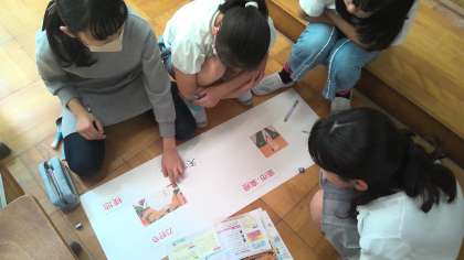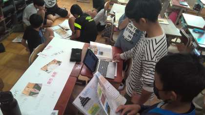 日本各地で争いが起こった戦国の世をだれがどのように治めていったのかを調べています。分かったことを班のメンバーと協力して一枚のシートにまとめていきます。