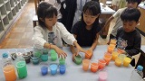 「ジュース屋さん。」「虹みたいにしたよ。」「魚みたいに並べたよ。」「あじさいみたい。」など、作った色水でたくさん楽しみました。
