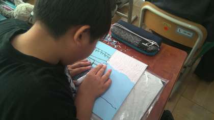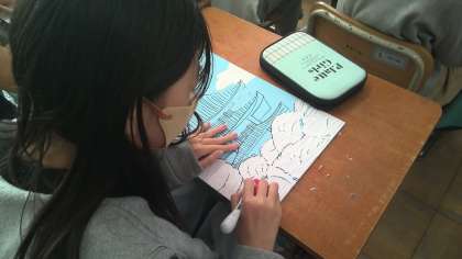 金閣寺やピサの斜塔など世界の美しい風景を版画で表現しています。下絵も版木に写し終わり、彫刻刀で板を彫っています。美しい版画になるように心をこめて彫っています。
