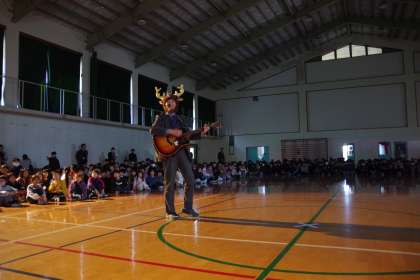 終業式の後、もうすぐクリスマスということで、校長先生から歌のプレゼントがありました。みんなも一緒に「あわてんぼうのサンタクロース」を元気に歌いました。