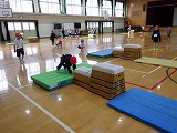 1年生はとび箱遊びの学習をしています。「ゴーゴーワールド」「ぴょんぴょんワールド」「横跳びワールド」「チャレンジワールド」の場を作って、着手・着地を大切に活動をしています。