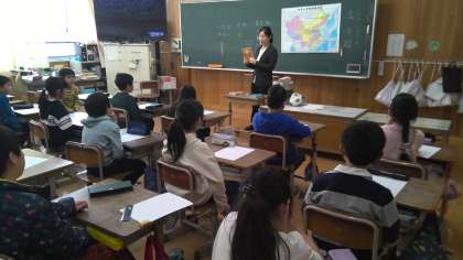 学活「となりの国の文化を知ろう」の学習で、ゲストティーチャーの先生に中国と韓国の歴史と文化を教えてもらいました。