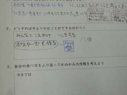 噛むことは、消化を助けるだけでなく、脳に刺激を与える作用もあると聞き、「賢くなるってこと?」と、驚きの声があがっていました。これからは、数を数えながら噛む、いつも意識するようにする等、よく噛むことを習慣化するためにいろいろな意見を出していました。
