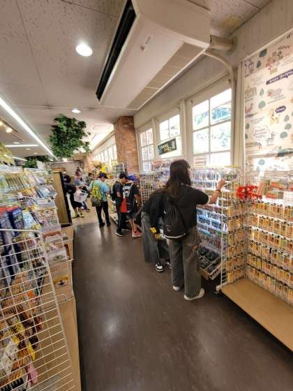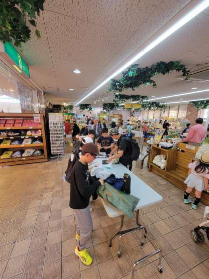 姫路セントラルパークで修学旅行1回目のショッピングを楽しんでいます。たくさんの土産物に囲まれてテンションが上がっています。