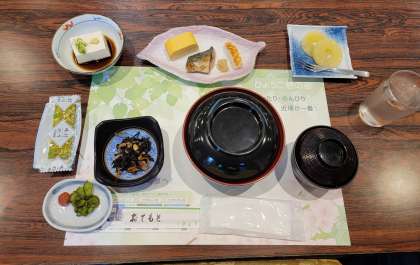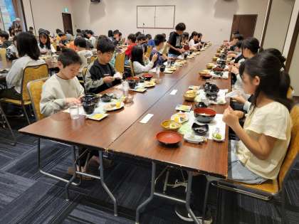 朝食が始まりました。今日は鶉野飛行場での平和学習、姫路城でのお城の見学に向かいます。