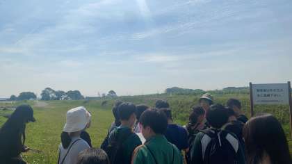 「soraかさい」での展示学習、鶉野飛行場滑走路跡や対空機銃座跡、防空壕跡など、第二次世界大戦時の戦争遺跡を巡り、子どもたちは自主的にメモをとり始めていました。