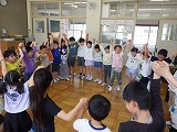 最初は、歌に合わせながら、自分の手で花を開かせていました。次は、体全部で、レンゲの花を表現していました。しかし、子どもたちからは、もっと大きなお花を咲かせたいという思いをもち、いつの間にか、友だち同士で手をつなぎ合って、みんなでとても大きなレンゲの花を作っていました。