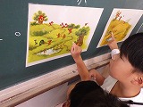 くまさんや、他の動物のセリフを考えている内に、どうして花が咲いたのかを話し合いました。2つの挿絵を見比べていると、種が落ちたところに花が咲いただけでなく、描かれている動物が増えていたり、色が茶色から緑色になっていたりということに気付きました。