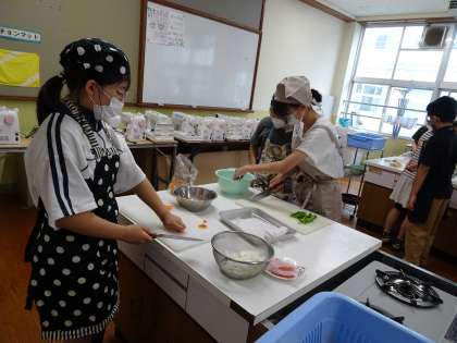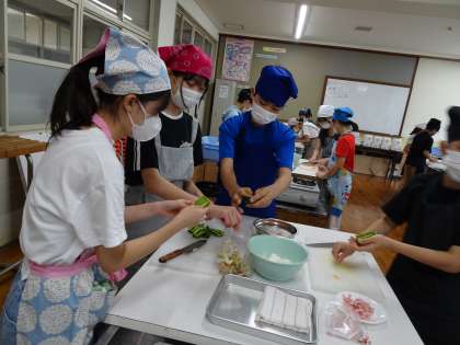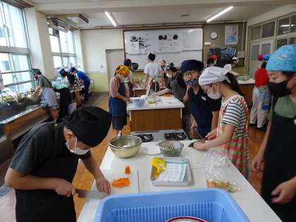 家庭科の学習で、栄養のバランスを考えた野菜炒めを作りました。久しぶりの、6年生になって初めての調理実習を楽しみにしていた様子でした。始まるとみんなで協力し、声をかけあい、安全に気をつけて調理することができました。炒め具合も味付けもバッチリ!!おいしかったです。