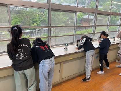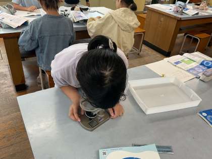 メダカの卵の中の様子を、双眼実体顕微鏡などを用いて、じっくりと観察しました。「ここが目かな?」「ドクドク動いている所がある!」と、たくさんの発見をしていました。