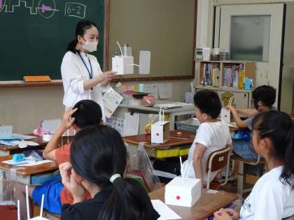 次の単元は「くるくるクランク」です。この学習では、不思議な形をしたクランクと呼ばれる針金に思い思いのものをつけ、上がったり下がったりするのを楽しむ作品を作ります。今回はそのキットを組み立てることをしました。実際に触ってみることで、「ここにつけたらよさそう。」「こう見せたいんだけど、どうしたらいいのかな。」と考えたり想像したりしやすくなりました。作品が出来上がるのを楽しみにしています。